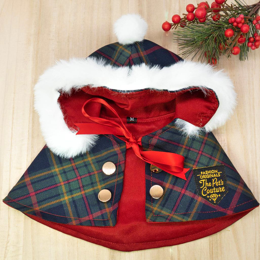 Xmas Hoodie Cape - Dark Green Ornaments Print with Red Faux Fur Trimmings