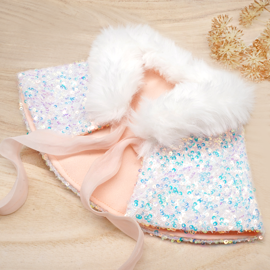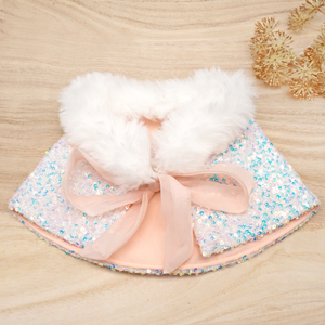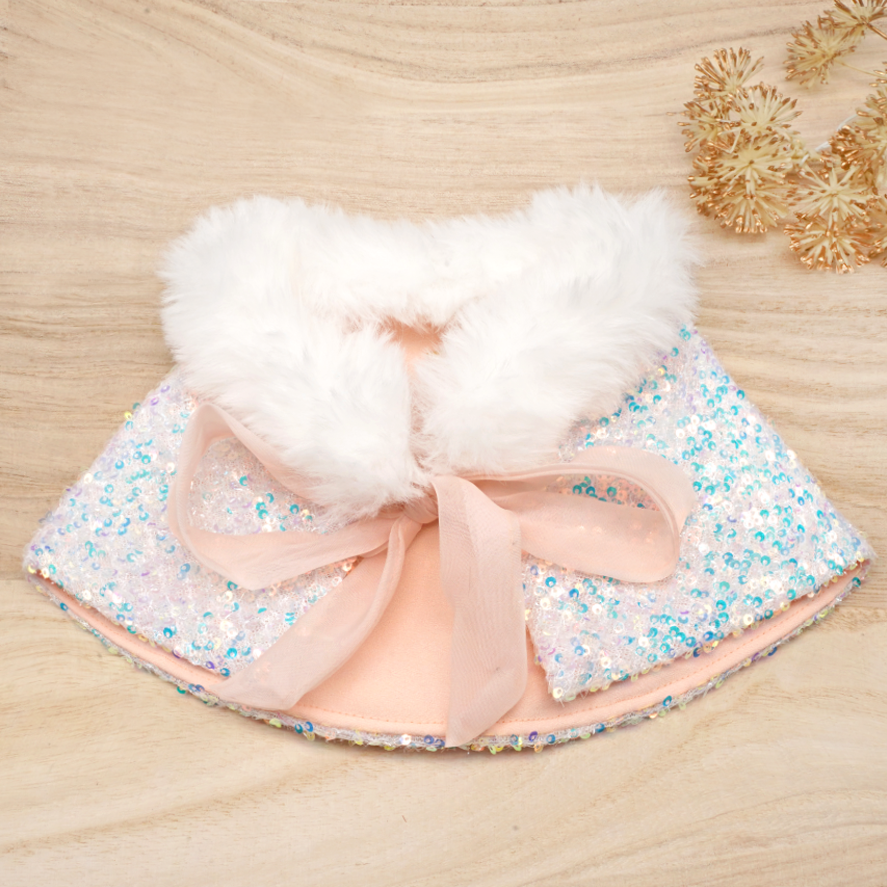 This beautifully sequin-embellished glitter cape is accented with faux fur panels and co-ordinating sequin details. Design and handmade by our dedicated TPC production team of artisans, only quality imported fabrics is screened and selected with our highest standard of workmanship just for you. Style and comfort made in mind for your pet. Perfect for a fashionable night out on the town or it can be worn just about anywhere!