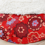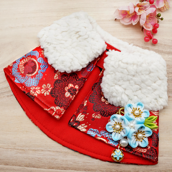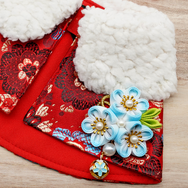Spring Of Blessings in Red Blue Blossoms CNY Cape with White Fur Collar