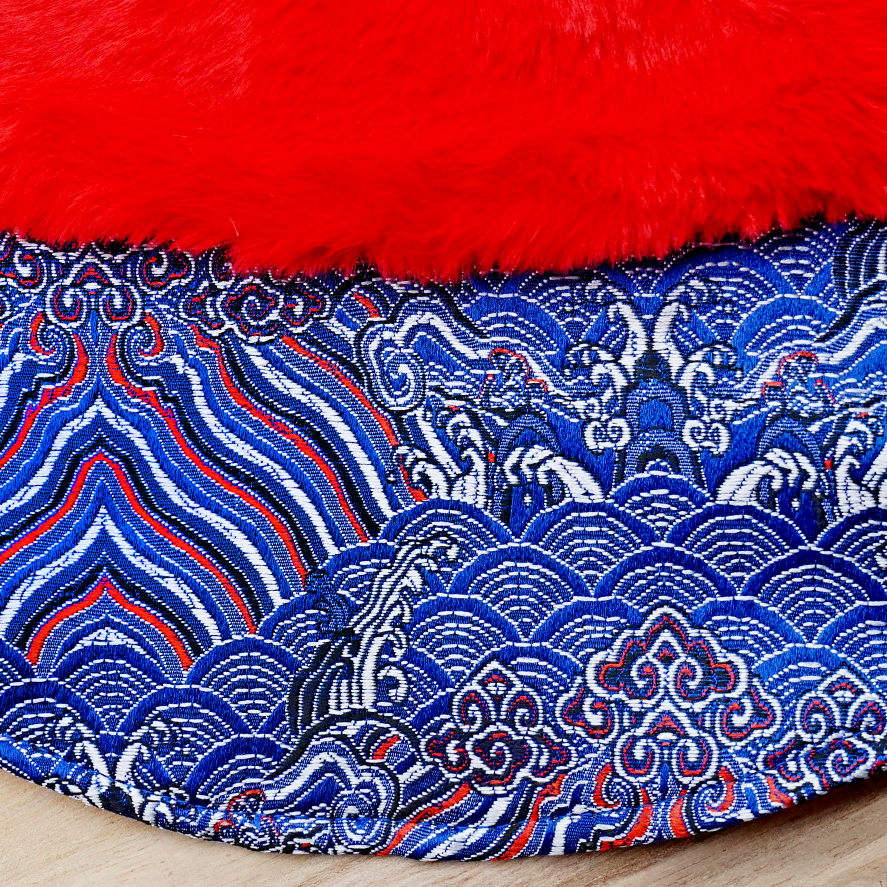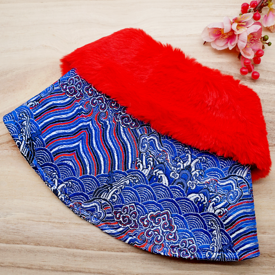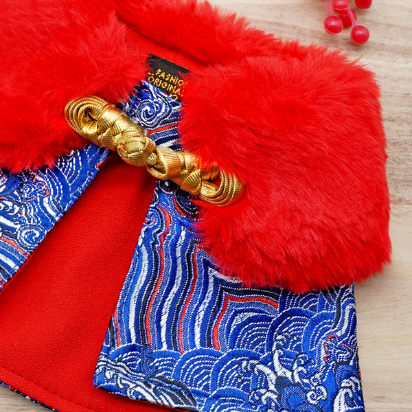 Spring Imperial Red Blue Waves CNY Cape with Red Faux Fur Collar