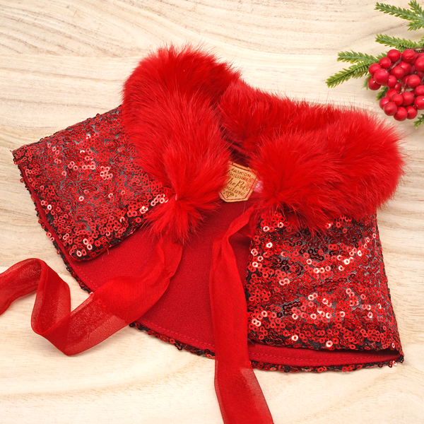 This beautifully sequin-embellished glitter cape is accented with faux fur panels and co-ordinating sequin details. Design and handmade by our dedicated TPC production team of artisans, only quality imported fabrics is screened and selected with our highest standard of workmanship just for you. Style and comfort made in mind for your pet. Perfect for a fashionable night out on the town or it can be worn just about anywhere!