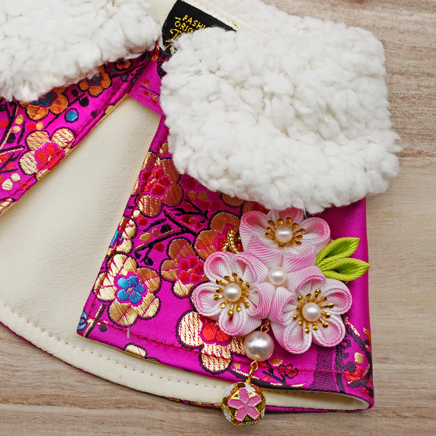 Spring Imperial Fuschia Gold Blossom CNY Cape with White Faux Fur Collar
